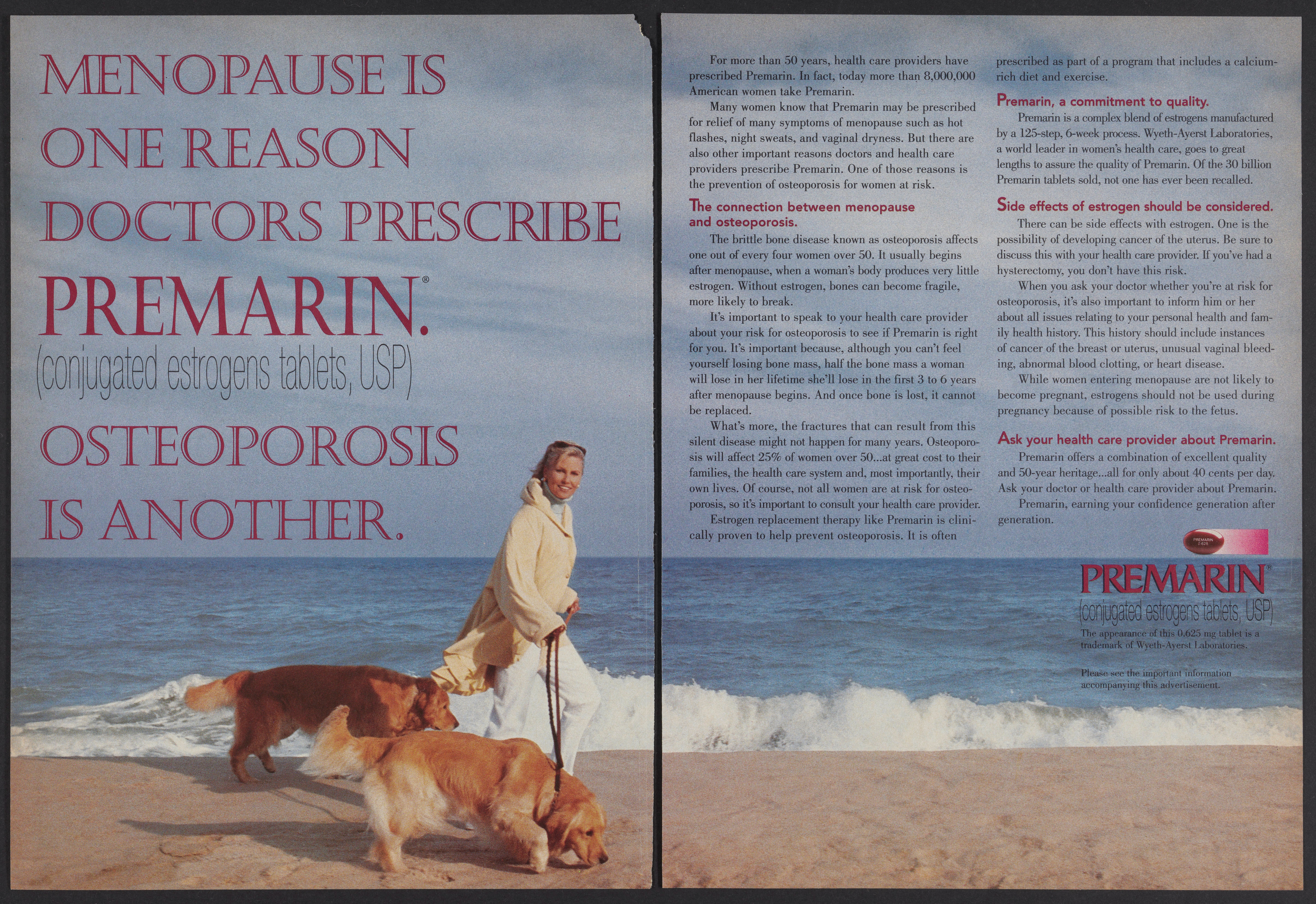 The product launched in 1941 under a trade name that advertised its origin: Premarin, (PREgnant MARe urINe).5 The name implied a “natural” origin transparently derived from a biological source rather than conjured in a synthetic laboratory. Approval from the U.S. Food and Drug Administration followed within a year, and the initial clinical reception was enthusiastic.